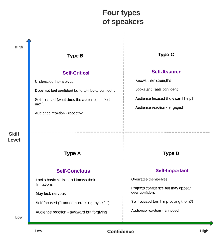 We all want to become a Type C speaker. Ideally, you progress from self-conscious to self-assured as you become a better speaker – i.e., your confidence increases in line with skills or competence. But the more typical path is to go from self-conscious to self-critical – your confidence grows much slower than your competence.
